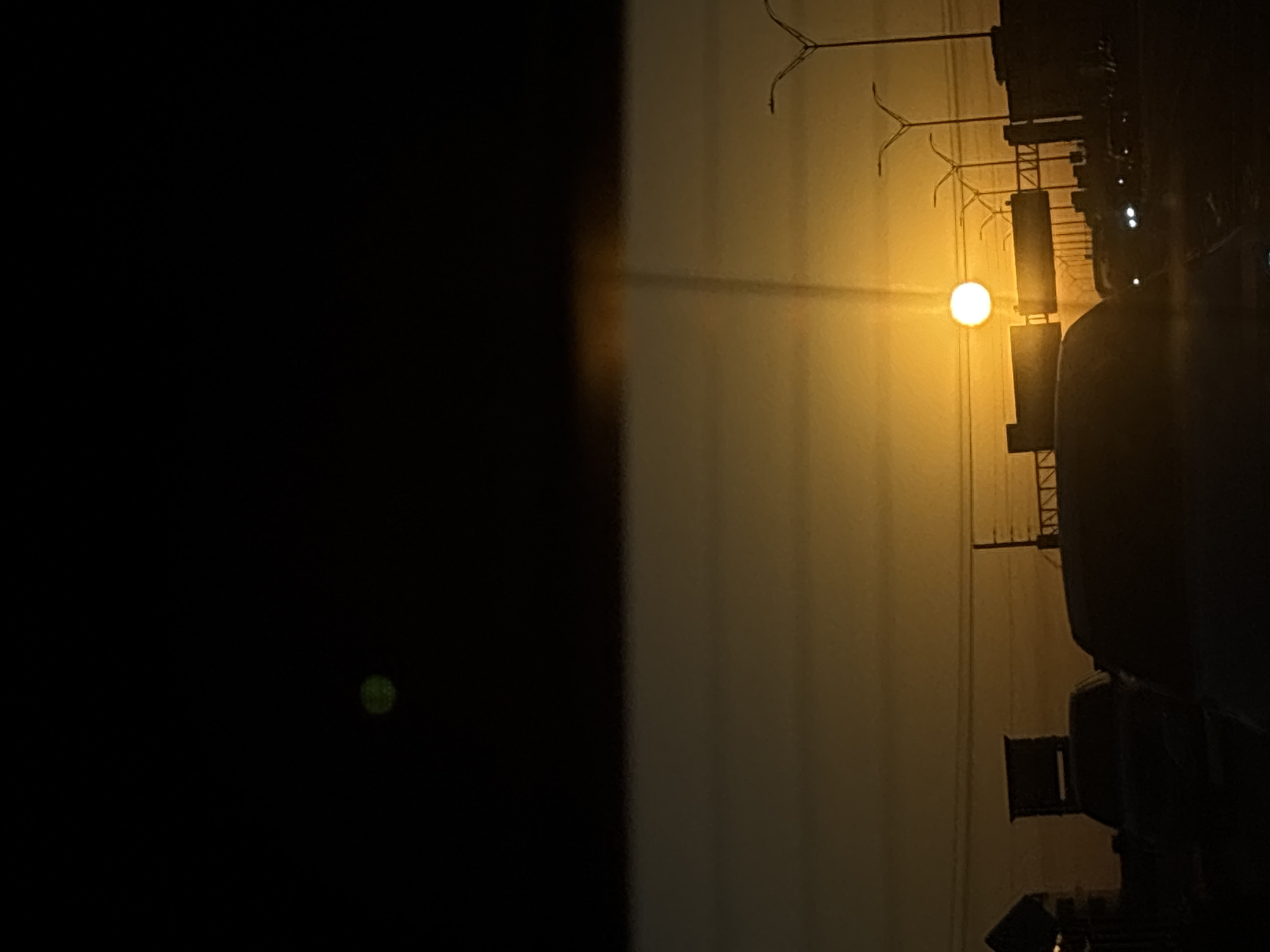 The image depicts a view from the interior of a vehicle on a multi-lane roadway during either sunrise or sunset, within the city of San Antonio, United States of America. The scene is dominated by a bright, circular, intensely orange-yellow sun positioned low on the horizon, slightly to the right of the frame's center. Strong lens flares emanate vertically from the sun, extending upwards into the dark sky. The sky transitions from vibrant orange and yellow near the sun to a darker amber, with the uppermost portion of the image appearing almost entirely black. A small, diffuse green light artifact is visible in the upper left quadrant of the dark sky. Silhouetted against the bright sky are multiple urban infrastructure elements. These include several streetlights with multi-arm designs, overhead gantry structures supporting road signs, and utility poles with visible wires running horizontally across the mid-ground. The foreground reveals the dark silhouette of the vehicle's dashboard and a portion of its hood, indicating the perspective is from the driver's or front passenger's seat. Ahead, multiple vehicles are visible as dark shapes, some displaying illuminated white headlights in the distance, suggesting active traffic flow. No specific landmarks are discernible to pinpoint an exact location within San Antonio, but the environment is consistent with a major highway or freeway. No individuals are distinctly visible.