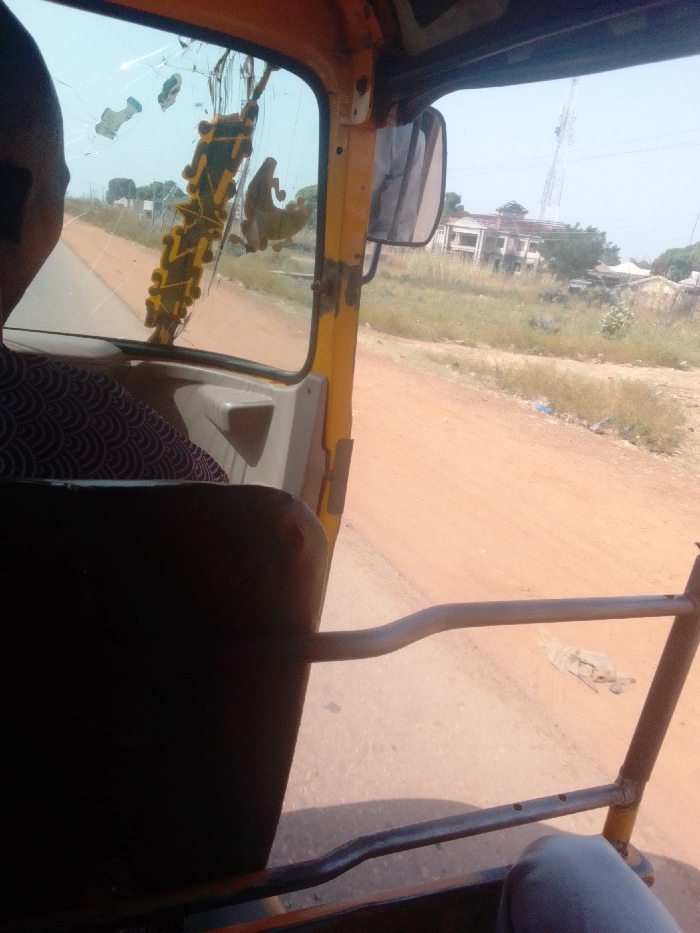 The image depicts a scene observed from inside a yellow three-wheeled motorized vehicle, likely an auto-rickshaw, in Katcha, Nigeria