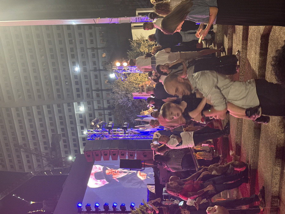 The image captures a nighttime outdoor gathering in Tel Aviv, Israel, set against the backdrop of the illuminated Azrieli Center Sarona Tower, a prominent high-rise building with a grid of numerous windows, visible in the background along with construction cranes on the upper left