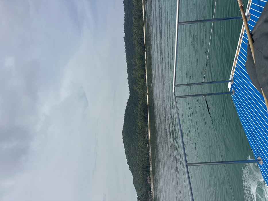 A partly cloudy sky hangs above a coastline densely covered in trees. The view is captured from the deck of a boat, indicated by the metal railing and blue striped floor visible on the right side. The water surface, textured by small waves, stretches out between the boat and the shore. A piece of clothing is visible next to the boat's railing.