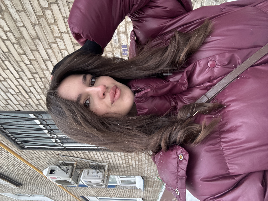An image taken in Moscow, Russia, depicts a young adult female from the chest up, positioned outdoors against a light-colored brick building on a snowy day