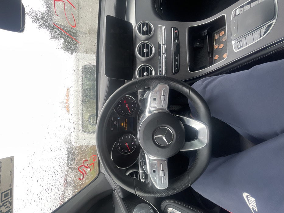 The image displays a scene from the interior of a vehicle, looking forward through a rain-splashed windshield. The scene is set in Plovdiv, Bulgaria, though no specific landmarks or geographic identifiers for the city are discernible within the image frame. **Vehicle Interior:** The vehicle is a Mercedes-Benz, identified by the prominent logo on the steering wheel and the distinctive dashboard architecture. The driver's instrument cluster, a digital display, shows a warning message: "12 V Battery See Owner's Manual." Additionally, the time "05:39" and an external temperature of "48°F" are visible. The central infotainment screen is dark. The center console features multiple controls, air vents, and an open storage compartment containing several copper-colored coins, consistent in appearance with US pennies. The dashboard utilizes a dark, textured trim, possibly a wood-like finish. **Occupant:** The lower portion of a person's body is visible in the driver's seat. The individual is wearing dark blue athletic pants with a white "NIKE" logo prominently displayed on the left thigh. No other personal identifiers are present. **Windshield Details:** The windshield is heavily covered in raindrops, indicating wet weather conditions. Red handwritten or painted characters are present on the interior side of the windshield: "JM" or similar on the upper left, and "12" or "R2" on the upper right. A white sticker with a black QR code and accompanying text is partially visible on the upper left, but its details are illegible. **Exterior Environment:** The background environment is indistinct due to the rain and focus. A large, white commercial vehicle, likely a box truck or large van, is positioned directly in front of the Mercedes-Benz. Beyond this vehicle, faint outlines of reddish structures, possibly building roofs, and sparse, bare tree branches are visible against an overcast, grey sky.