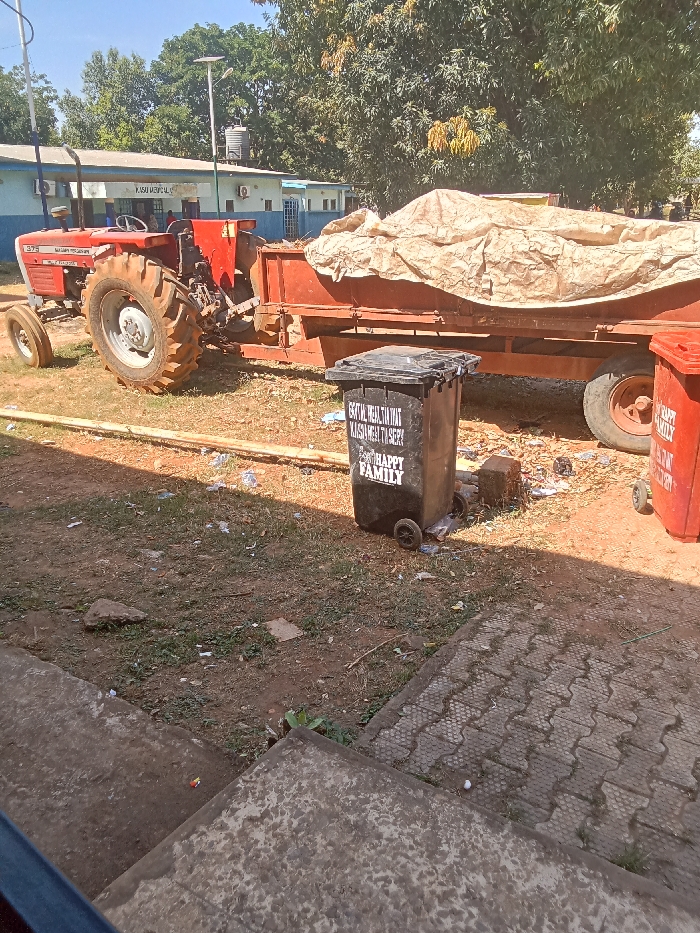 A daytime exterior scene depicts the KASU Medical Centre, likely situated within the Kabala district of Kaduna State, Nigeria. In the foreground, an unpaved dirt area with sparse grass and scattered litter is visible. A black wheeled refuse bin, featuring white text reading "GOMT. ML. HEALTH WAT KASSINGH WEAT TASTERY" and "FOR HAPPY FAMILY," stands centrally, next to a partially visible red wheeled bin. Behind these bins, a red Massey Ferguson 375 tractor is hitched to a large, rust-colored agricultural trailer. The trailer's contents are covered by a light-colored, possibly beige, tarp. In the background, a single-story building painted light blue with a darker blue lower trim displays "KASU MEDICAL" on its facade. A water tank on a stand and a solar-powered street light are positioned behind the building. Various green trees are visible in the mid-ground and background against a clear blue sky. No individuals are present.