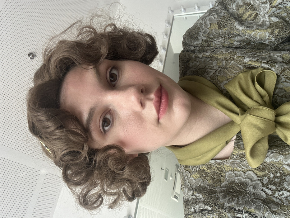 A light-skinned female individual is depicted in a head-and-shoulders portrait, facing directly towards the camera. She possesses shoulder-length, dark brown hair styled in tight curls, brown eyes, and wears light pink lipstick. Her attire includes a top or dress featuring a muted gold or olive-green base overlaid with greyish-brown lace, and an olive-green satin scarf tied in a prominent bow around her neck. The background is out of focus, revealing an indoor environment with a white ceiling composed of perforated acoustic panels. To the right, a mirror framed with multiple spherical light bulbs is partially visible. A white rectangular vent is present on the left side of the background. The precise location within Huangdao District, China, cannot be determined from the visual information provided.