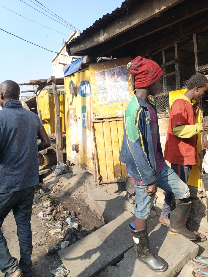 The image depicts an outdoor urban environment in Kofar Mazugal, Nigeria, under direct sunlight. In the background, several weathered yellow metal kiosks, possibly repurposed shipping containers, are visible, topped by a corrugated metal roof. One prominent kiosk displays an "MTN" logo and multiple posters, one of which includes the text "TANA MADORA." The ground consists of uneven dirt and mud, with a stream of dark liquid flowing through it, littered with scattered plastic bags and debris. A concrete slab, acting as a step or platform, is positioned in the foreground. Three males are present in the scene. On the far left, an adult male is seen from behind, wearing a short-sleeved grey shirt and dark trousers. He stands near a woven basket on the ground. In the mid-ground, a young male wears a red knitted beanie, a navy blue and green long-sleeved jacket over a purple shirt, and light blue jeans torn above the right knee. He stands with his left foot in a black rubber boot on the concrete slab, while his right foot is positioned behind it, partially obscured, possibly in a flip-flop. To his right, a second male, partially obscured, wears a red short-sleeved shirt over yellow long sleeves. He appears to be interacting with the yellow kiosk. Overhead utility wires are visible against a clear blue sky.