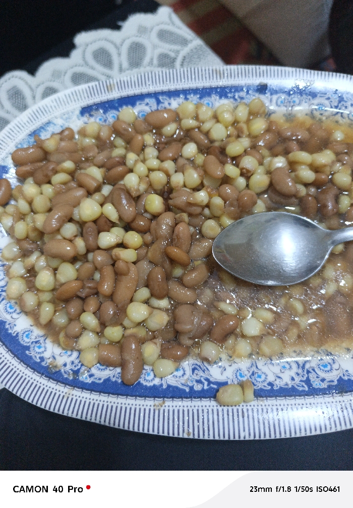 - "The image displays a close-up, overhead view of a meal consisting of githeri (a mixture of maize and beans) served in a round ceramic plate" by FM-Pkpag2, licensed under CC BY 4.0
