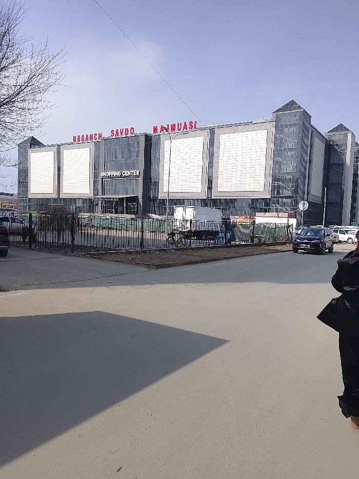 The image depicts a daytime scene in Urgench, Uzbekistan, focusing on a modern shopping center