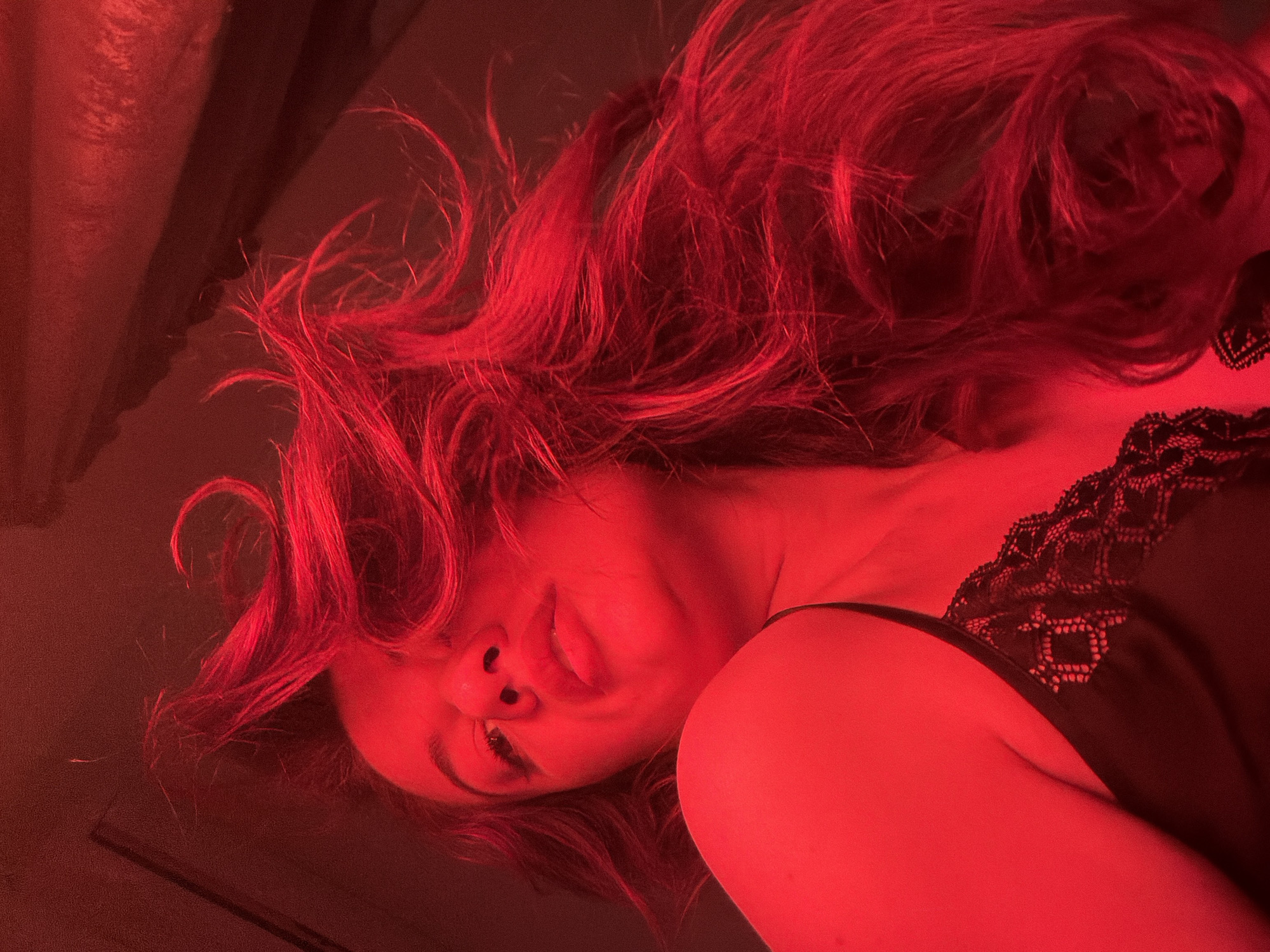 A woman with long, wavy red hair is lying down. She is wearing a black top with lace detailing. The scene is bathed in red light. The location is unknown and there is no evidence to suggest it is in Belgrade, Serbia.