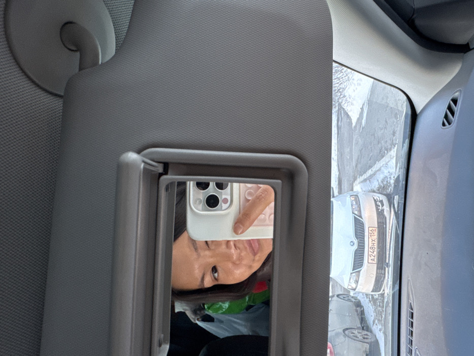 The image presents a candid scene captured from inside a vehicle. A grey sun visor, deployed downward, features a rectangular mirror reflecting the upper right portion of an adult female's face, primarily her right eye, and part of her mouth. She is actively engaged in taking a selfie, holding a light-colored smartphone with multiple rear cameras in her right hand, with her thumb visible against a light pink, textured phone case. Below the sun visor, through the vehicle's windshield, an outdoor parking area is visible under overcast or bright conditions. A white Skoda Rapid sedan is parked directly in front, facing the camera. Its front bumper displays minor scuff marks. The vehicle's Russian license plate, A248HX 156, is clearly legible, indicating the vehicle is registered in the Orenburg Oblast of Russia. The ground surrounding the parked vehicles is partially covered with patches of snow and slush, suggesting winter or early spring conditions. To the left of the Skoda, another vehicle is partially visible. The dashboard of the observer's vehicle, dark and featuring an air vent on the right, frames the lower part of the outdoor view. The overall environment suggests a typical urban or suburban parking lot in Orenburg, Russia, during a colder season.