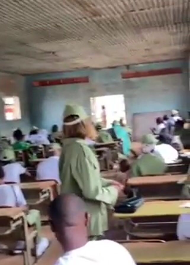 inside of a classroom. Many people are sitting at desks, most of whom appear to be wearing green uniforms and caps. A few individuals are dressed in white shirts. One young child wearing a white shirt and blue shorts is sitting on the edge of a desk. A person in a green uniform walks through the classroom. The room has a corrugated metal roof. The walls are painted a muted color and have windows. Desks and chairs are present throughout the room. Some people have papers on their desks, while others are looking at their phones.