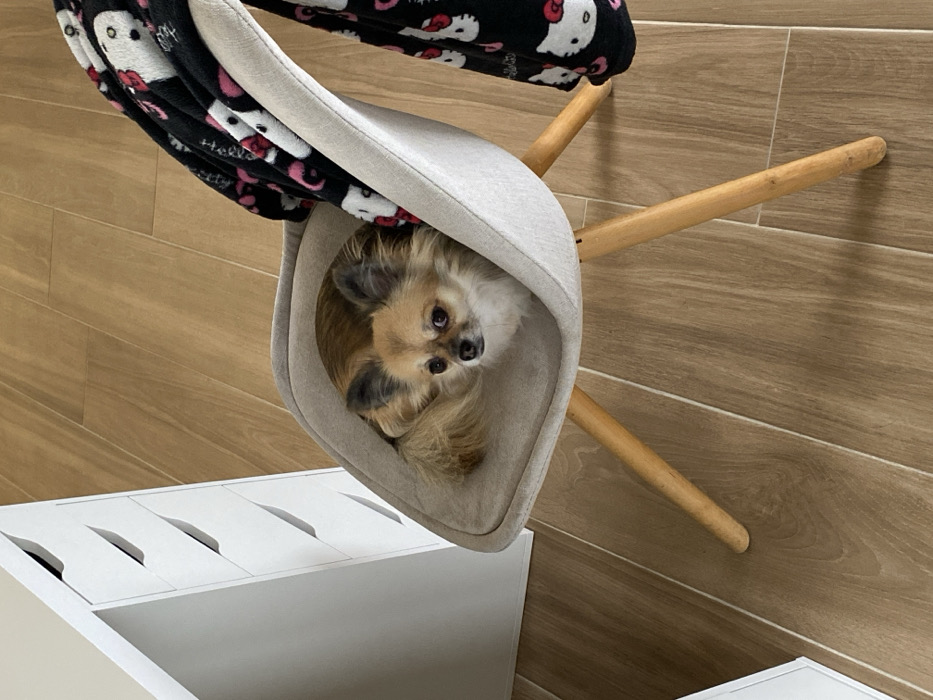 - "A long-haired Chihuahua dog, predominantly tan with white chest markings and a darker muzzle, is curled into a compact resting position on the light gray cushioned seat of a modern chair" by FM-Aco812, licensed under CC BY 4.0