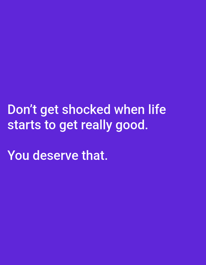 The image presents a motivational message against a solid purple background. In white text, the statement reads, "Don't get shocked when life starts to get really good." This is followed by the affirmative declaration, "You deserve that." The text is centered vertically, suggesting an encouraging tone.