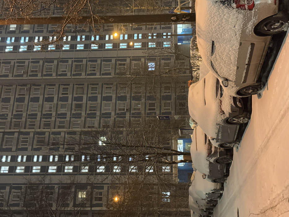 A tall apartment building stands with numerous lit windows in a grid pattern. Bare tree branches are visible in the foreground, partially obscuring the building. Several cars are parked along the street, heavily covered in snow. The scene is bathed in the soft glow of streetlights, indicating nighttime. Snow is also visible on the ground.