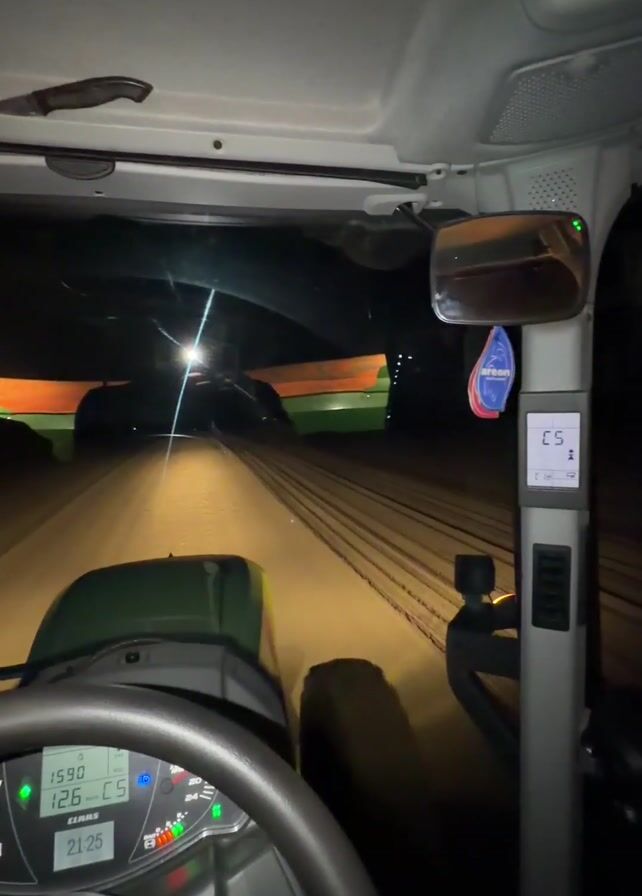The video is shot from inside the cabin of a vehicle, likely a tractor or farm vehicle, driving at night