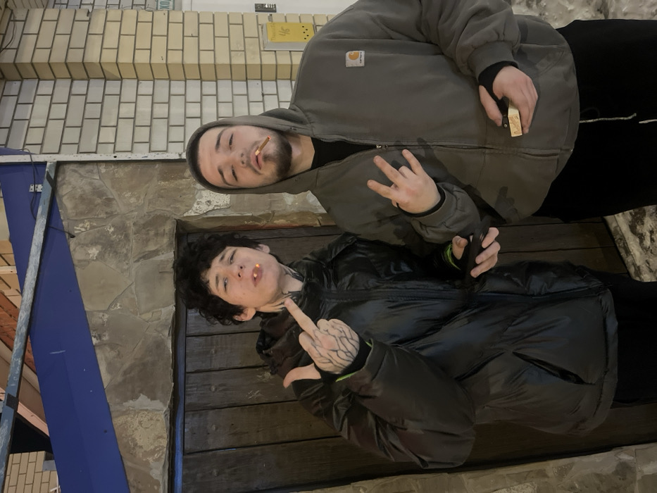 Two young men pose outside. The top man wears a Carhartt jacket, black pants, and holds a lighter. He holds up two fingers, smiles, and has a cigarette in his mouth. The bottom man wears a shiny puffer jacket, black pants, and flips off the camera with a tattooed hand. He also has a cigarette in his mouth. They stand in front of a stone wall and brown door with brick and siding visible above.