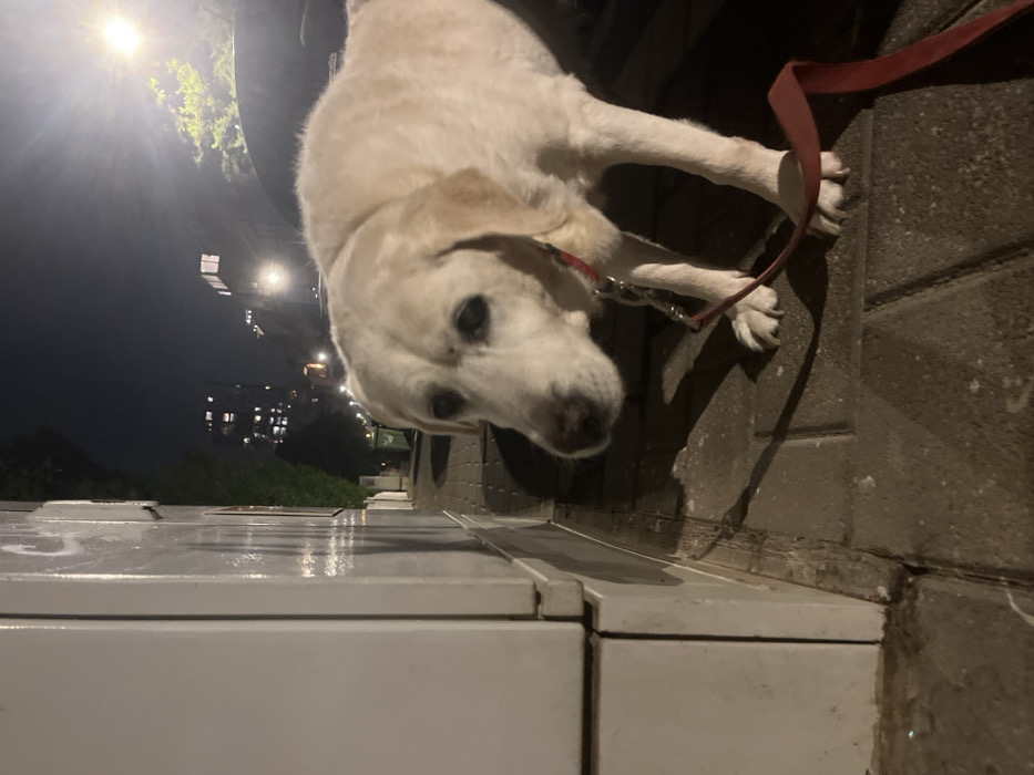 A light-colored Labrador Retriever peers upside-down into the camera. The dog's leash is red, and it stands on a gray concrete surface. The background is dark, showing buildings illuminated by streetlights. The lower portion of the image shows a white surface, possibly a ledge or table, with visible seams. The overall lighting suggests an evening setting.