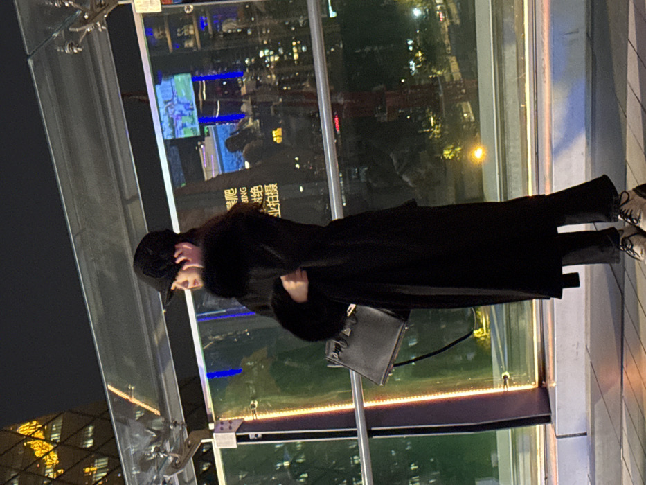 The image displays an individual standing outdoors at night in Chaoyang District, Beijing, China. The person, positioned in profile facing left, is wearing a dark, possibly black, bucket hat, a long black coat with a fur-trimmed collar and fur cuffs, dark trousers, and light-colored shoes. A black structured handbag with metallic hardware is visible on their left side. Their right hand holds a dark object, consistent with a mobile phone, to their right ear. The individual stands adjacent to a transparent barrier or railing supported by metal posts, which incorporate vertical luminous strips. The background reveals a nocturnal urban landscape featuring numerous illuminated high-rise buildings. Prominently situated in the upper-left background is the distinctively shaped China Central Television (CCTV) Headquarters building, lit with yellow internal lights. Reflections on the transparent barrier include partially legible Chinese characters such as "肥" (féi), "绝" (jué), and "业拍摄" (yè pāishè), along with a rectangular screen displaying what appears to be a sports event. Additional city lights are discernible at lower elevations beyond the barrier.