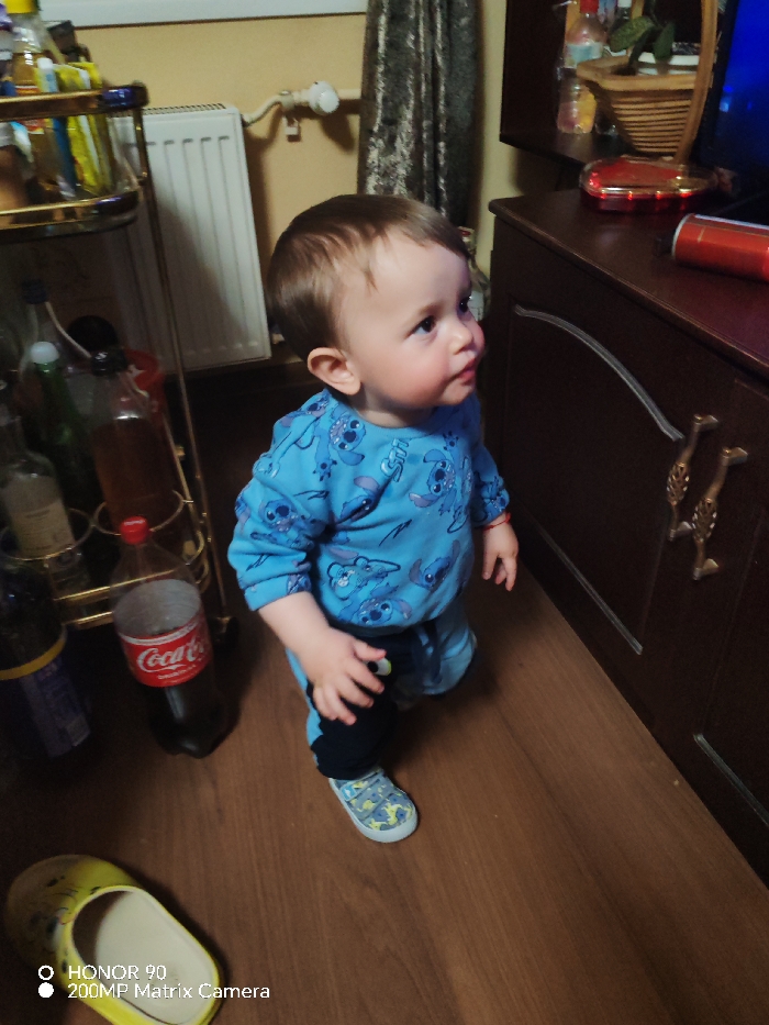 An indoor scene in a domestic dwelling, located in Sofia, Bulgaria, features a young child in the center-right of the frame. The child, a toddler with short brown hair and fair skin, is dressed in a light blue long-sleeved shirt and matching pants patterned with blue cartoon characters, along with light-colored sneakers. A red string bracelet is visible on the child's right wrist. The child stands on a light brown wooden floor, looking upwards and to the right, with a slightly open mouth. To the left, a tall, narrow, golden-colored metal trolley or shelving unit holds multiple bottles, including glass bottles containing liquids. On the floor beside this unit, a large plastic Coca-Cola bottle with a red cap is visible, appearing to have a frosted or textured exterior. In the far left background, a white wall-mounted radiator is present against a light-colored wall, adjacent to a dark, patterned curtain. To the right of the child, a dark brown wooden cabinet or dresser with two drawers and two ornate, gold-colored metal handles is visible. On the top surface of this cabinet, an electronic screen (likely a television) displays a blue light, alongside a red cylindrical object and other indistinct items. In the lower-left foreground, a single yellow slipper with a cartoon design lies on the wooden floor. The scene is lit by artificial indoor light.