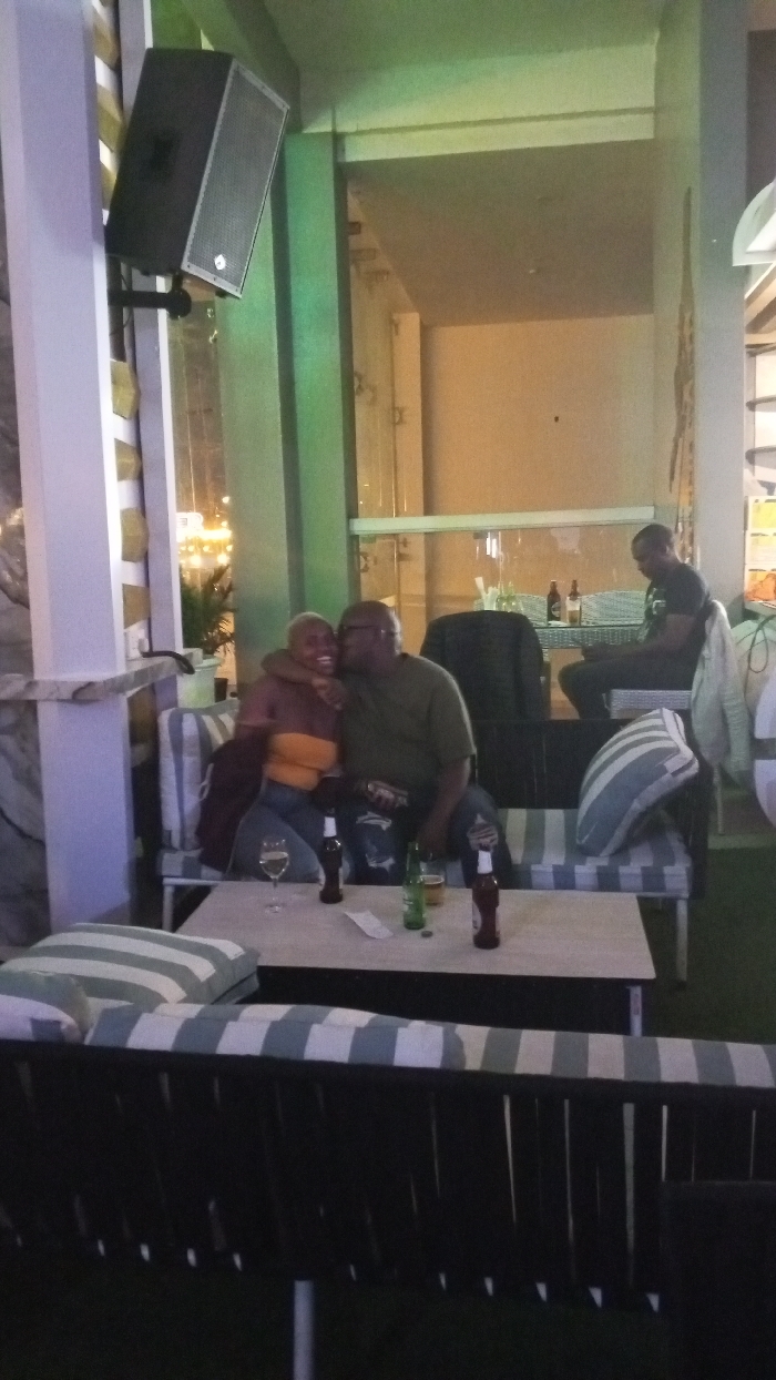 A casual outdoor scene captures two individuals embracing on a striped couch with a low table laden with beverages. A man in glasses and a green shirt is kissing a woman with a buzz cut. The setting seems relaxed, with additional seating nearby and another person sitting in the background. A large speaker is mounted to the left, indicating potential entertainment. Overall, it presents an intimate moment shared in a public space.