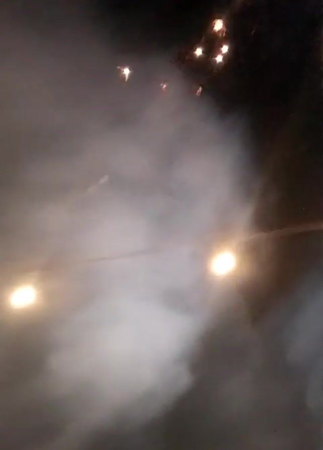 The video depicts fireworks being set off at night. There is a significant amount of smoke present, partially obscuring the view. Two streetlights shine brightly in the background, adding to the illumination. The fireworks launch upwards, leaving fiery trails against the dark sky.
