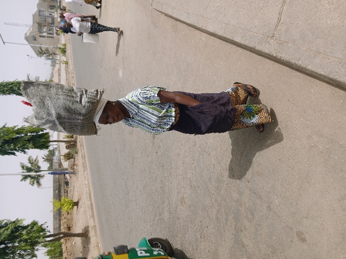 The image portrays an outdoor street scene in Kadoma, Zimbabwe, captured on a bright, clear day. In the foreground, slightly left of center, an adult female with dark skin walks forward, angled slightly to her right. She wears a white head covering, a short-sleeved collared shirt with horizontal white and light green stripes, a dark blue or black skirt with a patterned lower hem, and dark flip-flops. A large, grey, woven sack, containing a red item at its peak, is balanced on her head. Her right hand is obscured, possibly in a pocket. To her immediate left, the front portion of a green and yellow auto-rickshaw, displaying "PT" and "39," is partially visible. The paved road surface extends into the background, bordered on the right by a raised curb. Further down the road, another adult female, dressed in a white t-shirt and patterned leggings, carries a white bucket. Other indistinct figures are visible in the distant background. The environment includes several tall, slender green trees, a palm tree, and various bushes lining the road. A concrete bridge structure is present in the mid-ground. In the far background, multiple buildings, including a multi-story structure, and utility poles are visible. Shadows are cast to the right of the main subject, indicating a high sun position.