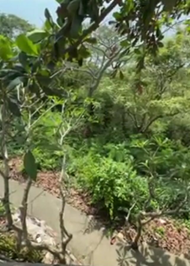 The camera slowly pans from a vantage point overlooking a lush, green landscape down to reveal a vibrant cluster of pink bougainvillea flowers amidst dense vegetation. The scene is predominantly filled with various shades of green from the foliage, with the sea visible in the distance.