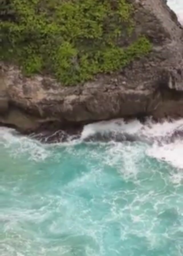 The video displays a high-angle view of a rocky cliffside meeting a turquoise ocean