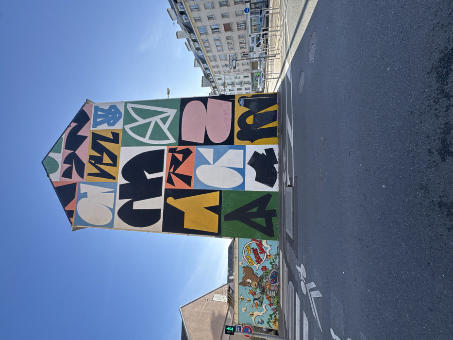 This image captures an urban street scene in Caen, France, at the intersection of Rue Sainte Hélène and Rue de la Miséricorde. The dominant feature is a five-story building with a gable roof, located on the corner, whose entire side facade is adorned with a large, vibrant mural. This mural is composed of a grid of abstract, geometric shapes and stylized letters or symbols, rendered in a palette of black, white, yellow, teal, light blue, orange, and pink. To the left of the main mural, on the lower wall of a separate, light pink-colored building, a secondary mural depicts a cartoonish brown bear character in a green tank, holding a red spray can, with a speech bubble containing the text "STOP WAR START LOVE!". Bees and colorful flowers surround this character. The foreground consists of an asphalt street featuring white pedestrian crosswalk markings and a bicycle lane symbol. A functional green pedestrian traffic light is visible on the left, below which a partial red "STOP" sign is mounted. Across the street to the right, a row of multi-story, light-colored European buildings with numerous windows and pitched roofs line the block. Several parked vehicles, including cars and vans, are visible along this street. Metal bollards or barriers are present on the right sidewalk corner. The sky is clear and blue, and the scene is brightly lit by sunlight, casting distinct shadows. No individuals are present in the image.