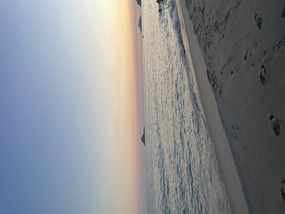 A tranquil beach scene unfolds at dawn or dusk. The sky transitions from a light blue to a gradient of orange and yellow. Calm waves gently wash ashore, meeting a sandy beach marked with footprints. A few distant land formations or islands punctuate the horizon, adding depth to the seascape. The scene conveys serenity and the quiet beauty of nature.