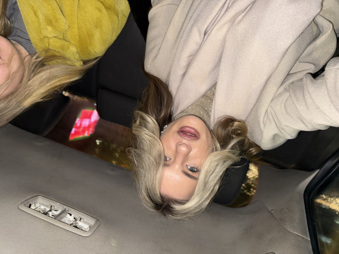 A blonde woman with blue eyes is seated in the back of a car. She wears a tan coat over a shimmering top. Part of another person wearing a yellow jacket is visible in the left corner. The car's interior, including the ceiling and window, frames the shot, while the city lights are visible through the window.