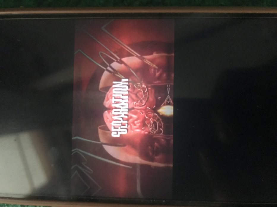 A vertically oriented smartphone is depicted, resting on a textured green surface. The phone's screen displays an abstract graphic. This graphic features two dark, stylized human head profiles facing each other, separated by a central, three-dimensional representation of a human brain. The brain model is intricately entwined with metallic chains and emits a yellow-orange glow from a light source positioned directly beneath its lower central part. The word "SEPARATION" is displayed prominently in white, sans-serif, capitalized letters across the upper mid-section of the graphic, centered above the brain structure. The background of the graphic is a deep red with faint, angular line patterns. The image itself contains no specific geographical landmarks or unique identifiers to confirm the specified location of Bogor, Indonesia.