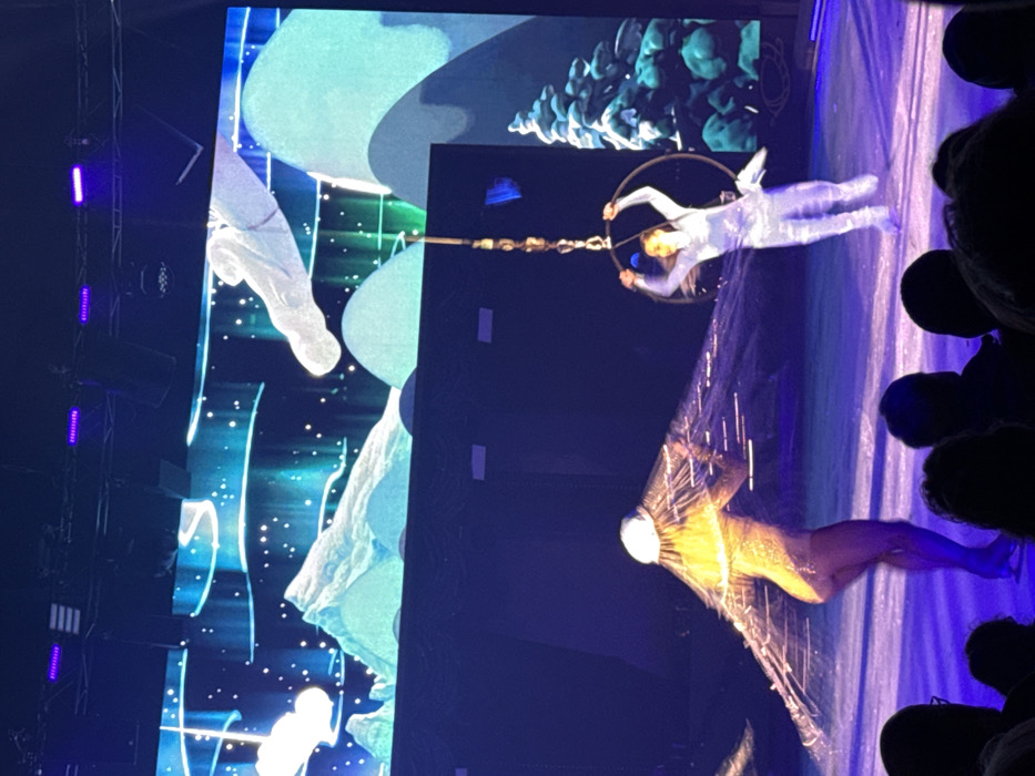 An indoor show with a large LED screen in the background depicting a winter scene. In the foreground, an acrobat in a white suit hangs in a hoop suspended by a gold chain. Below, another performer with a yellow costume is being showered with water. The audience is visible in the right-hand corner. The stage and screen are brightly lit with vibrant colors.