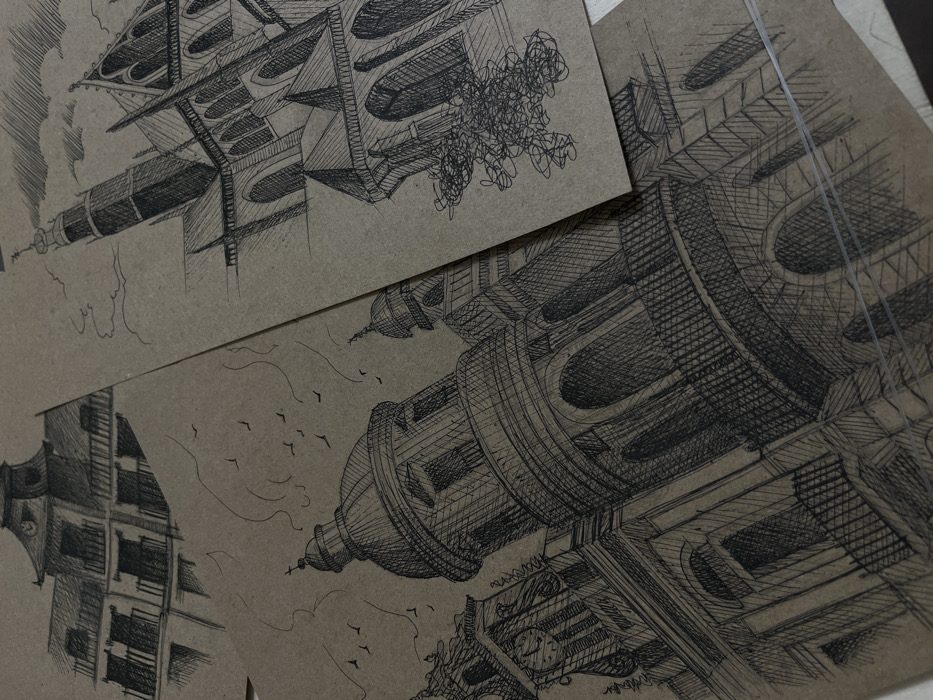 Three pen-and-ink architectural sketches are arranged overlapping on a flat, light-colored surface