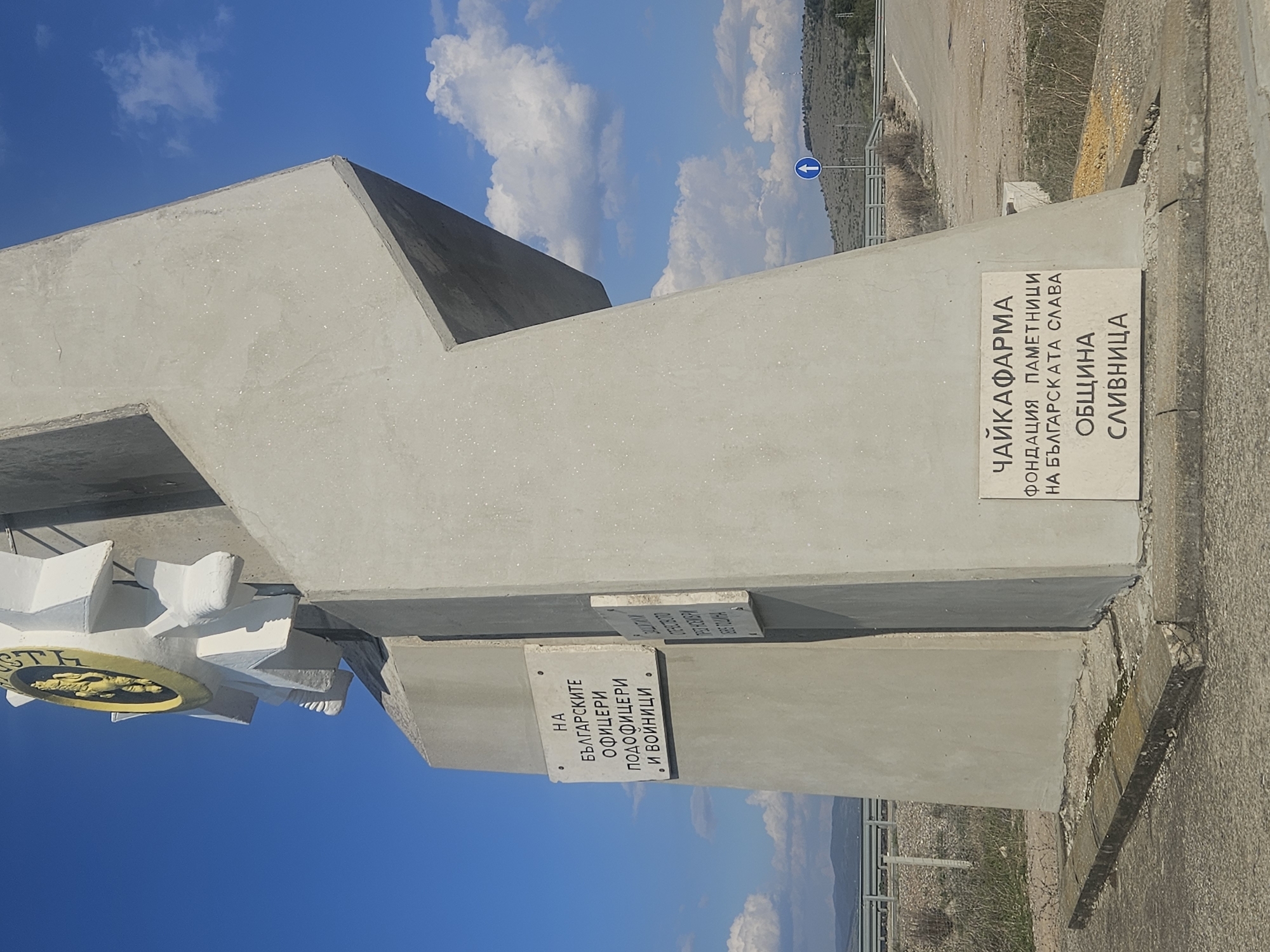 monument in Slivnitsa, Bulgaria. The monument is dedicated to Bulgarian officers, non-commissioned officers, and soldiers. It was funded by Чайкафарма (Chayka Pharma) and the municipality of Slivnitsa. The sky is blue with some clouds. There is a road with a sign indicating a turn to the left. A grassy hillside is in the background.