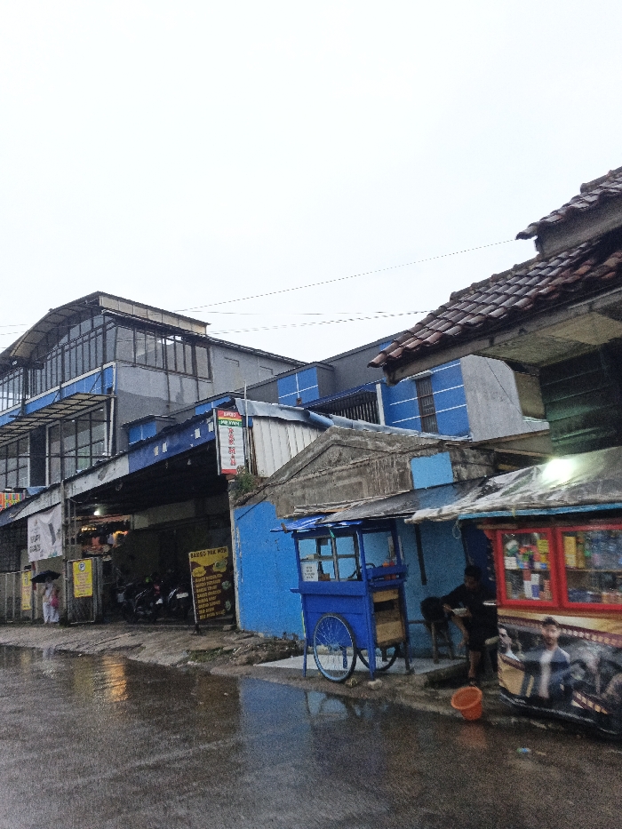 The image depicts an urban street scene in the city of Carmen, Philippines, under overcast daylight conditions. The pavement is wet and reflective, consistent with recent rainfall. On the left, a multi-story building features a modern design with an arched roofline, extensive glass paneling, and blue horizontal accents against grey walls. Below this, an open commercial space contains several parked motorcycles. A yellow "P" parking sign is visible near the entrance. A vertical sign displays "BAKSO PAK HEN" alongside menu items. One individual, partially visible, stands on the wet pavement holding a white umbrella. To the right, a series of smaller structures line the street. A blue-painted building with a corrugated metal roof is visible. In front of it, a blue, two-wheeled street vendor cart is positioned. Adjacent to this, a red-framed street stall with a promotional banner depicting a male figure is present. This stall has a tiled roof section. A sign reading "LUCKY'S MR. YUMMY" is affixed above the blue structure. An individual dressed in dark clothing is bending down between the blue cart and the red stall, attending to an object on the ground, possibly a bowl or container. An orange plastic bucket lies on the ground near this individual. Overhead utility wires traverse the light grey sky. The ground throughout the visible area is dark, wet, and shows reflections.