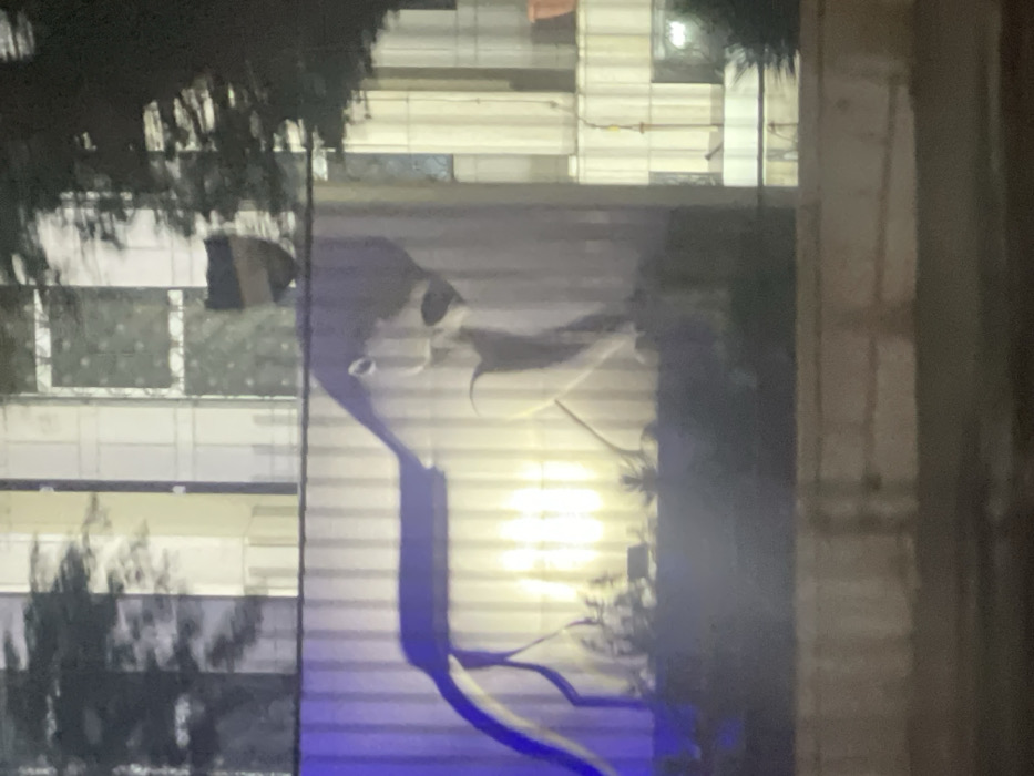This nighttime image depicts a large, stylized sculpture of a lion, illuminated by artificial lights, in As-Salihiya Municipality, Syria. The light-toned lion sculpture appears to be in a crouching or walking pose, positioned against a vertically ribbed wall or fence. Multiple vertical yellow lights emanate from behind the lion, creating a bright glow, with additional blue illumination visible on the sculpture's left side. Below the lion, a planter contains sparse green foliage. In the background, a multi-story building with numerous windows is visible, partially obscured by dark tree branches on both the left and right. The overall scene is dark, characteristic of night, relying solely on artificial light sources. A low, light-colored wall or curb is present in the immediate foreground. A small, dark object is discernible near the top right of the ribbed wall, and a single orange pot rests on a ledge of the distant background building.