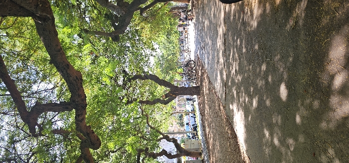 The image depicts Rothschild Boulevard in Tel Aviv, Israel, viewed from a low perspective looking down the length of the thoroughfare. Overhead, a dense canopy of mature trees with thick, gnarled trunks and bright green foliage dominates the upper and mid-portions of the frame, casting extensive dappled shadows across the scene. The immediate foreground shows a paved pathway, likely asphalt or dark concrete, marked by irregular patches of sunlight and shadow. Small organic debris, possibly leaves or seeds, is scattered on this surface. To the left of the paved path, a strip of reddish-brown mulch or exposed earth runs parallel to the path. Further left, beyond a line of trees, a street is visible with several parked white vehicles, including what appear to be vans. In the midground, on the right side of the paved path, a large group of bicycles is parked beneath the shade of another tree. Multiple indistinct human figures are visible walking or moving along the path further into the distance. Buildings are faintly discernible through the tree line in the far background. The scene is illuminated by bright daylight, indicating clear weather.