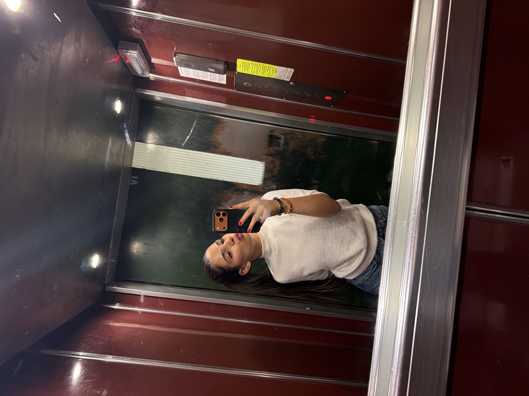 A young woman is observed taking a mirrored selfie inside an elevator cabin