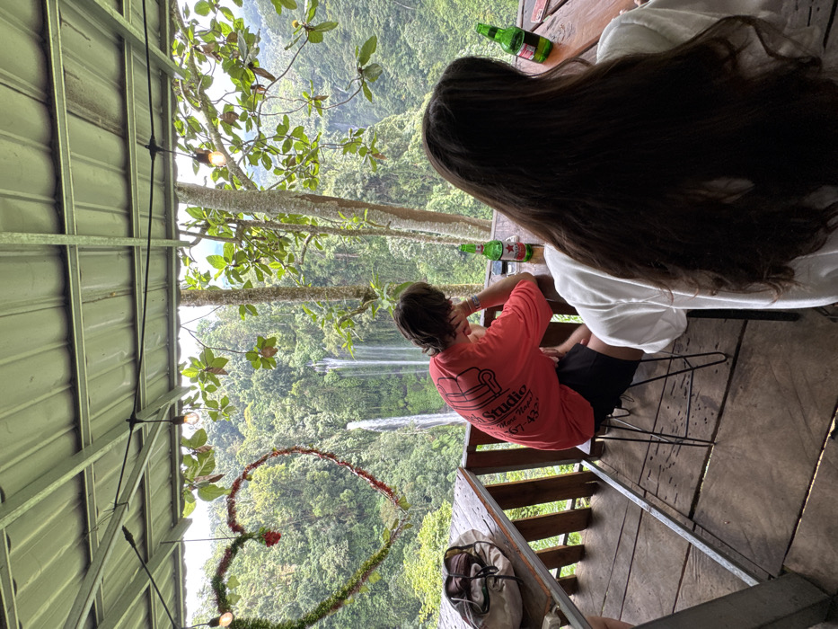 Two people sit at a wooden table on a deck, overlooking a lush green forest with a waterfall in the distance