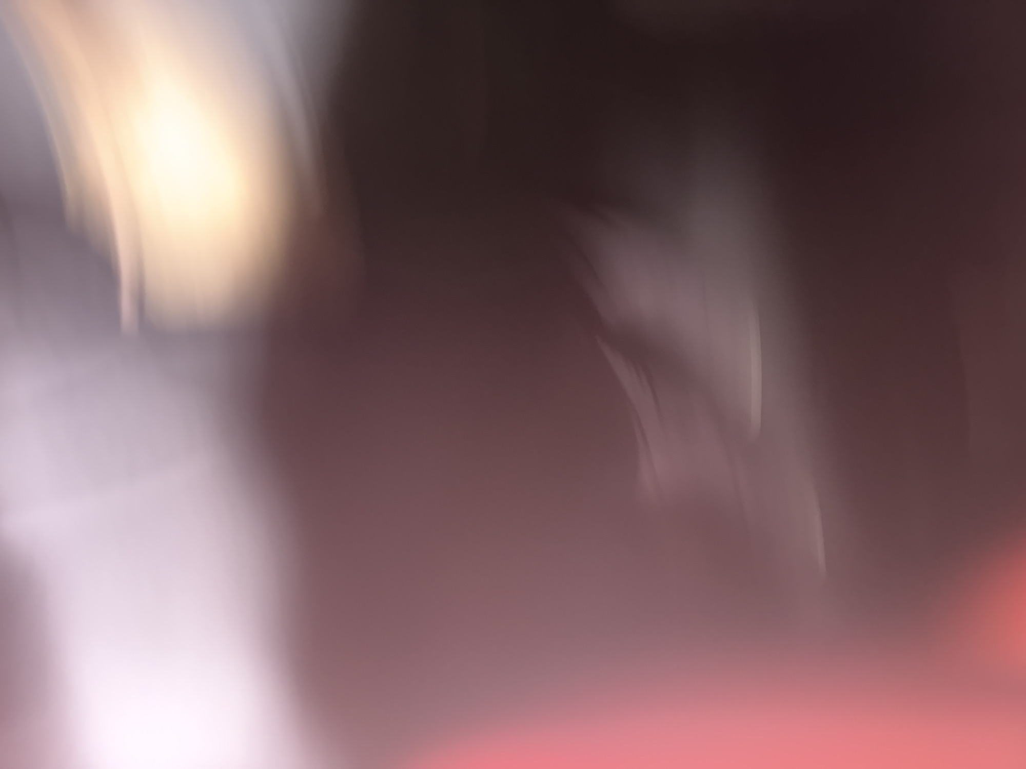 The image presents an abstract composition dominated by severe motion blur and out-of-focus elements, rendering all subjects indistinguishable. Predominant colors include gradients of faded pink and muted purple on the left, transitioning into darker brown and grey tones across the majority of the frame. A singular, intensely bright, diffuse yellow-orange light source is prominently situated in the upper-right quadrant, creating a strong glow and streaks across the blurred field. No discernible people, objects, structures, or environmental features are identifiable. Consequently, no actions or interactions can be observed. The visual information is insufficient to determine a specific location within the city of Paris, France, or any other geographical area.