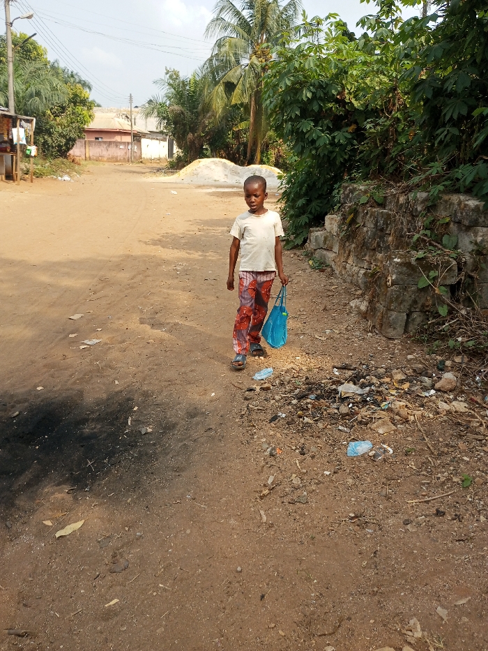 The image depicts an outdoor scene in Orie Uratta, Nigeria, focusing on a young Black male child on an unpaved, reddish-brown dirt path