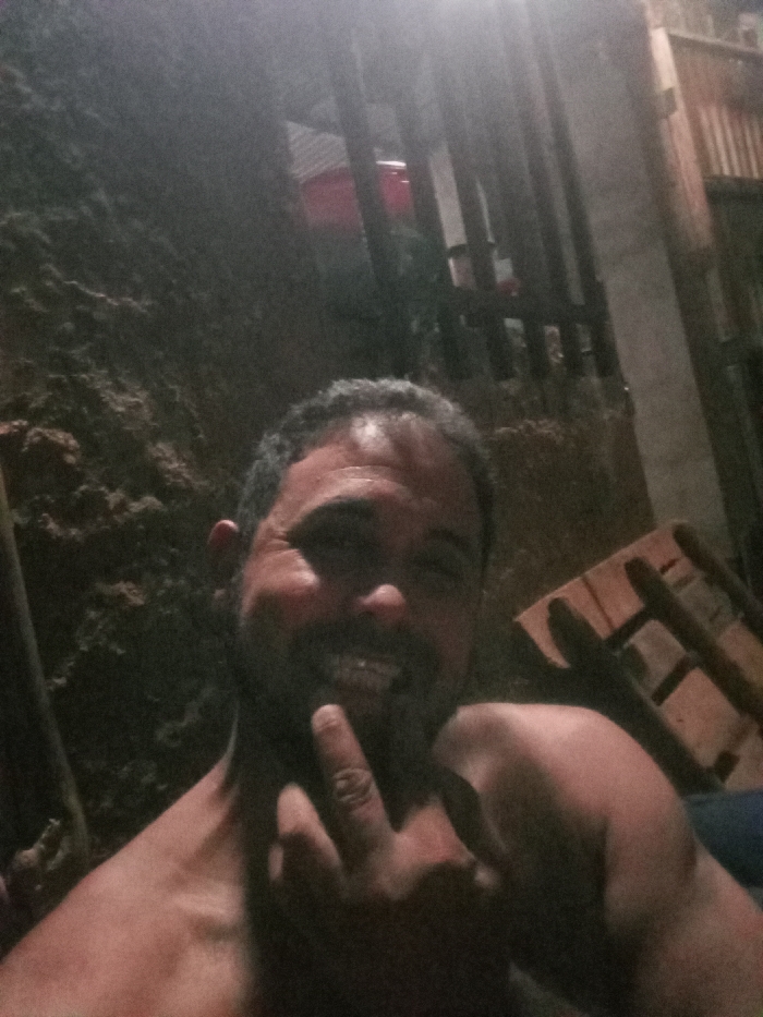 A shirtless man, bathed in dim lighting, raises his middle finger towards the camera. He has short, dark hair and a beard, and his teeth are visible in a slight grin. The background is a mix of dark textures, possibly a dirt wall and some wooden structures. The image appears to be taken from a low angle. The overall scene has a rough, informal feel.