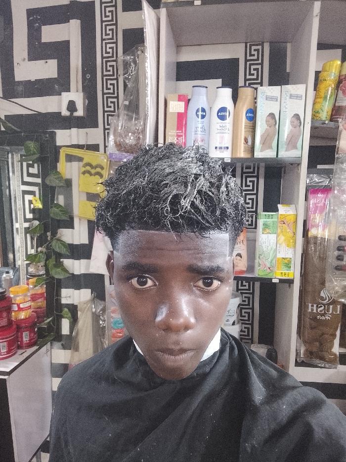 - "An indoor, head-and-shoulders portrait captured in a barbershop or beauty supply store in Umuahia, Nigeria, depicts a dark-skinned male" by FM-6VMfu2, licensed under CC BY 4.0