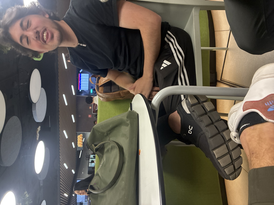 The image depicts an indoor scene within a modern public space, specifically a lounge or cafeteria, located in Mexico City, Mexico. In the foreground, a young adult male is seated on the right side, facing partially towards the camera. He has dark, wavy hair and is wearing a black short-sleeved t-shirt and black athletic pants with three white stripes along the outer seams, consistent with the Adidas brand. A silver cylindrical pendant hangs from a chain around his neck. He is captured with his mouth open, tongue slightly extended. His hands are clasped and resting in his lap. He wears black sneakers with a chunky, segmented grey sole, displaying the "oc" logo (On Cloud brand). A white circular table with a black rim separates the immediate foreground. On the table's left side, a large olive-green tote bag with dark green handles is resting. Small orange fragments, consistent with food debris, are visible on the white table surface. In the lower-left corner, the lower leg and foot of another person are visible, wearing a white sneaker with red and blue accents, an Adidas logo, and a black sock. Behind the seated male, a brown leather backpack with a quilted pattern rests on green upholstered seating. The background reveals a spacious area with a high ceiling adorned with multiple circular grey acoustic panels and recessed rectangular strip lighting. A digital sign in the mid-ground prominently displays the word "TIENDITA" in illuminated orange letters. Further in the background, several blurred figures are visible, some seated, and at least two large digital display screens showing colored information grids are present. The seating arrangements include green upholstered bench-style units and light grey plastic chairs. The flooring appears to be tiled.