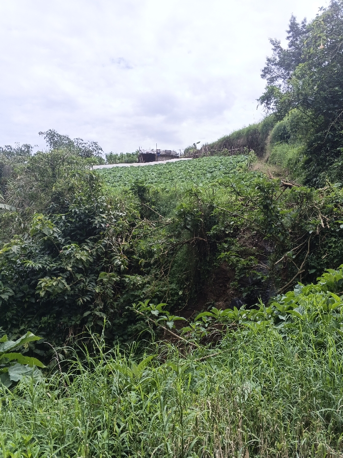 A verdant hillside displays a patchwork of cultivated cabbage fields under a cloudy sky. A simple dwelling sits atop the slope. Lush greenery fills the foreground, with tall grasses and dense bushes obscuring the lower levels. A small drainage gully cuts through the vegetation. The scene conveys a rural, possibly agricultural, landscape.