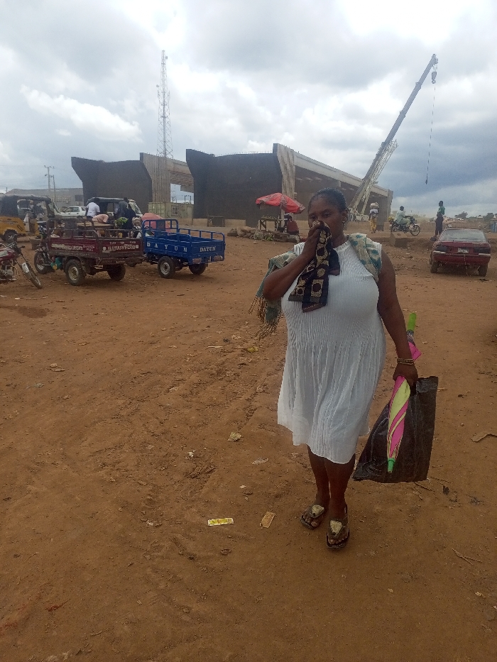 The scene depicts an unpaved, reddish-brown earthen area in Adonkolo, Nigeria, under an overcast sky. In the foreground, a woman walks towards the observer, slightly right of center. She wears a white, sleeveless, pleated dress and dark sandals with light-colored embellishments. Her right hand holds a dark-patterned cloth to her nose or mouth area. Her left hand carries a black plastic bag and a multi-colored umbrella (pink, yellow, green). Multiple bracelets are present on her left wrist. The midground features several vehicles and human activity. On the left, a motorcycle is parked. Adjacent to it are two three-wheeled cargo vehicles, one reddish-brown and one blue, both displaying "DAYUN" branding. Individuals are visible near these vehicles. Further right, a red sedan is parked. A vendor stall with a red umbrella is visible, with people present. The background is dominated by large, unfinished concrete structures indicative of a bridge or flyover under construction. A tall communications tower stands between these structures. To the right of the bridge, a large construction crane is positioned. Additional individuals are present in the distant background, including one on a motorcycle.