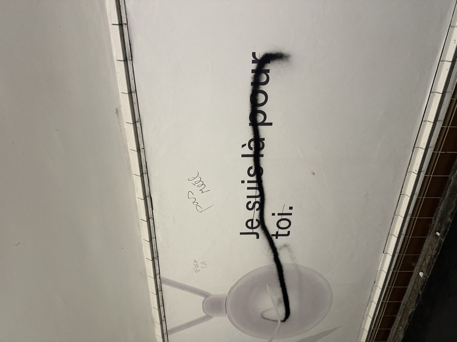 The image displays an interior wall within what appears to be a Paris Métro station in France, characterized by its architectural style and French text. The primary subject is a large white wall featuring a printed message in black sans-serif font that reads "Je suis là pour toi." (French for "I am here for you."). To the left, a faint, light purple graphic depicting a circular pendant on a braided cord is partially visible. The wall has been defaced with graffiti: 1. A thick, undulating line of black spray paint extends horizontally across the lower portion of the "Je suis là pour toi" text, originating near the pendant graphic, passing beneath "Je suis là," and continuing over and around "pour," ending with a concentrated spray mark to the right of "pour." 2. Above and to the left of the main text, the phrase "pas réel" (French for "not real") is written in black handwritten script. 3. Further to the left, beneath the braided cord graphic, the text "FUCK IA" is also written in smaller black handwritten script. The wall structure includes a lower horizontal trim composed of small, rectangular white tiles, positioned above a darker brown tiled or panel section. Above the main white wall, a narrow white horizontal trim separates it from an upper wall section painted a uniform light gray. No individuals are present in the scene.