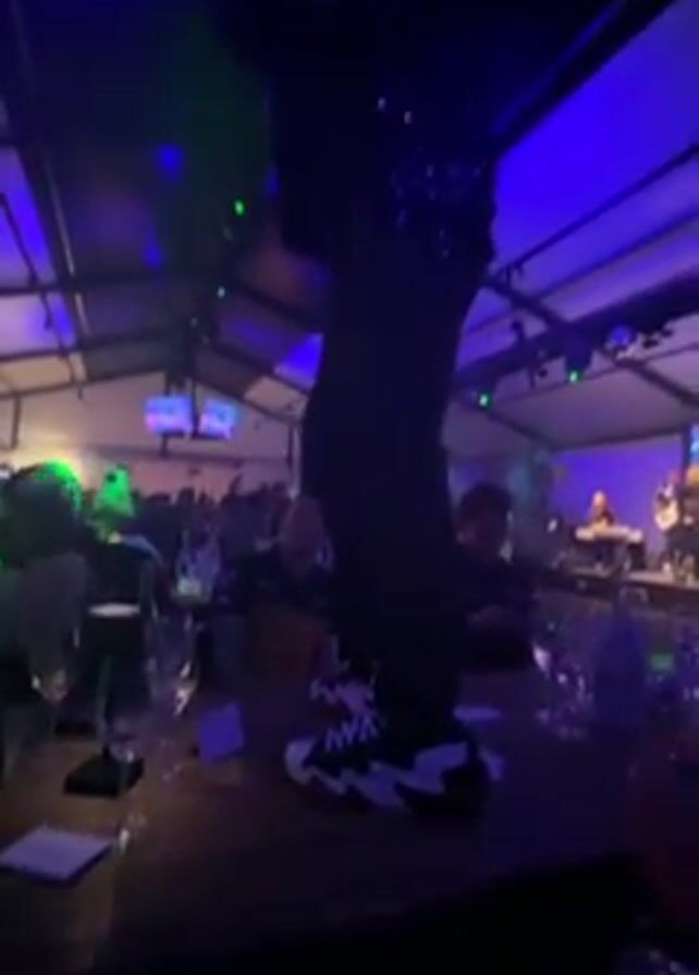 person standing on a table at an event. The person is wearing black pants and black-and-white sneakers. The room is brightly lit with green and blue lights, giving a party atmosphere. There are other people sitting at tables around the room, watching the person on the table. There are glasses and bottles on the table. A band can be seen in the background.