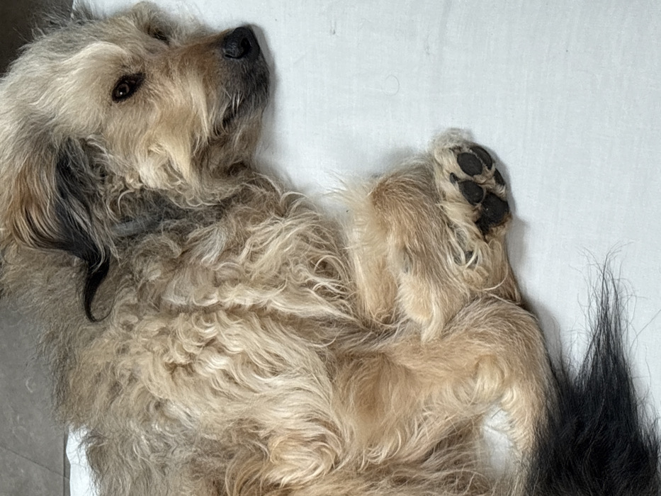 - "The image displays a medium-sized dog lying on its right side on a light-colored surface" by FM-wE9nL2, licensed under CC BY 4.0