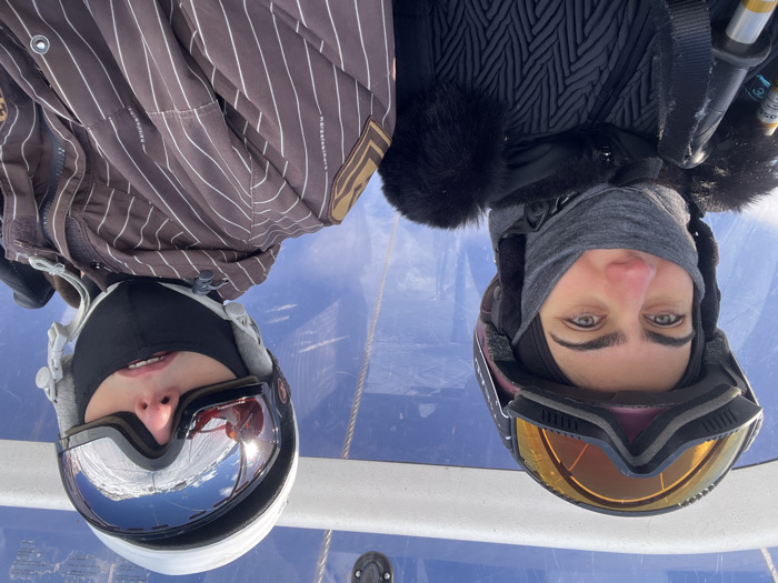 Two individuals are depicted in a close-up, eye-level shot, likely within a ski lift cabin, against a clear blue sky background